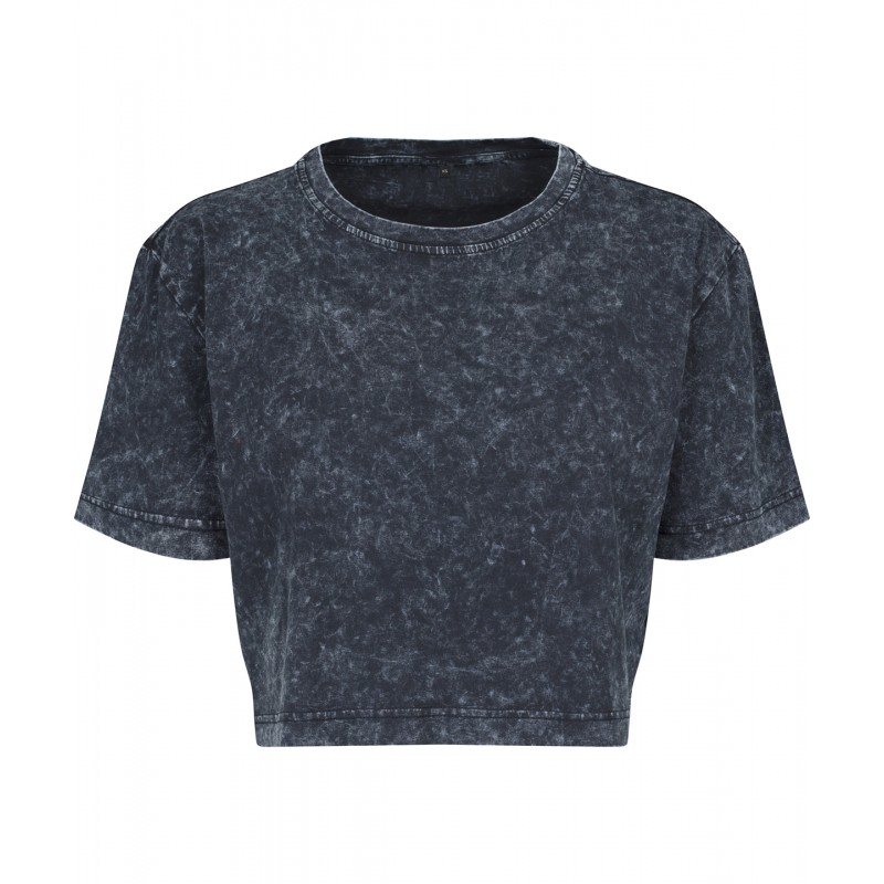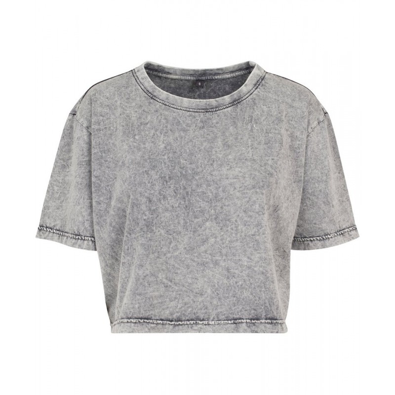 An immediate attention grabber: the Women's acid washed cropped tee combines the casual, slightly square oversized cut with a shortened fit. The trendy wash emphasizes the urban look. This soft single jersey fabric is perfect for screen printing and flex printing.