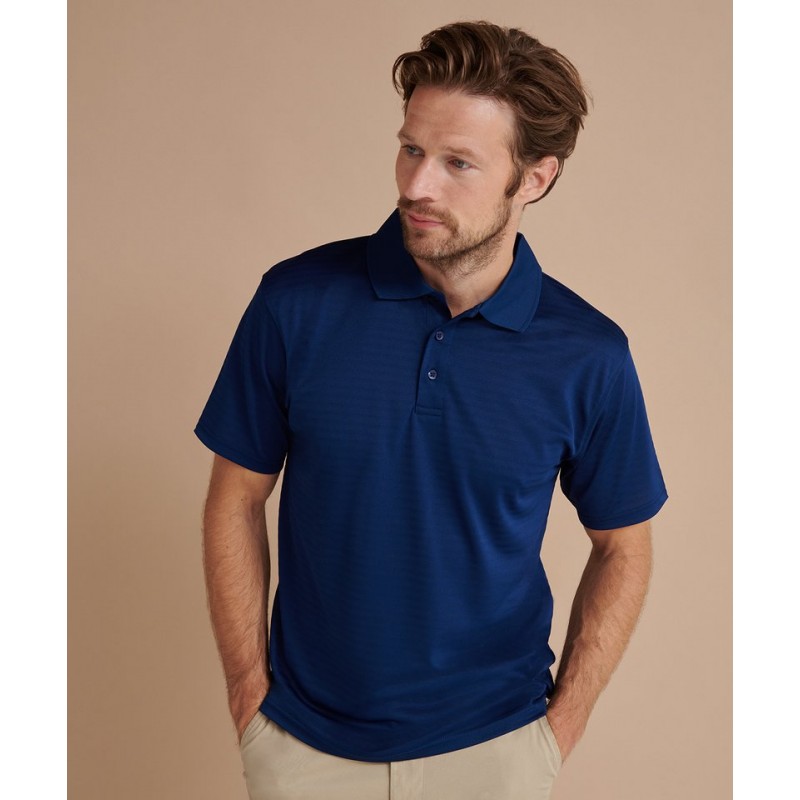 | Features | Cooltouch® wicking polo shirt. Textured stripe fabric with flat knit collar. Side vents for ease of movement. Contrast tape detail in back neck and side vents. Dyed to match buttons. Permanent wicking yarn for prolonged performance. Excellent colour retention. Minimum iron. Easycare. |