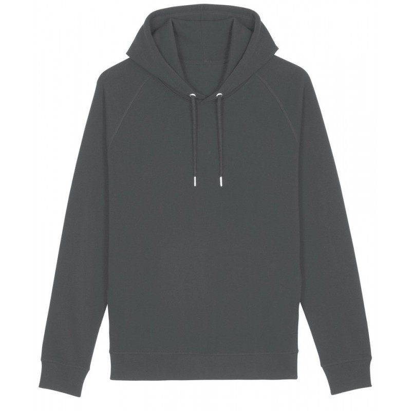 The raglan unisex hoodie sweatshirt in premium brushed 300gsm fleece, 85% organic cotton, and 15% recycled polyester. Featuring a double self-fabric hood lining which offers sturdy and durable wear, plus matt silver metal eyelets, and drawcord tipping. There is flatlock top-stitching, side pocket offering a bigger space for decoration and a half-moon at back neck.