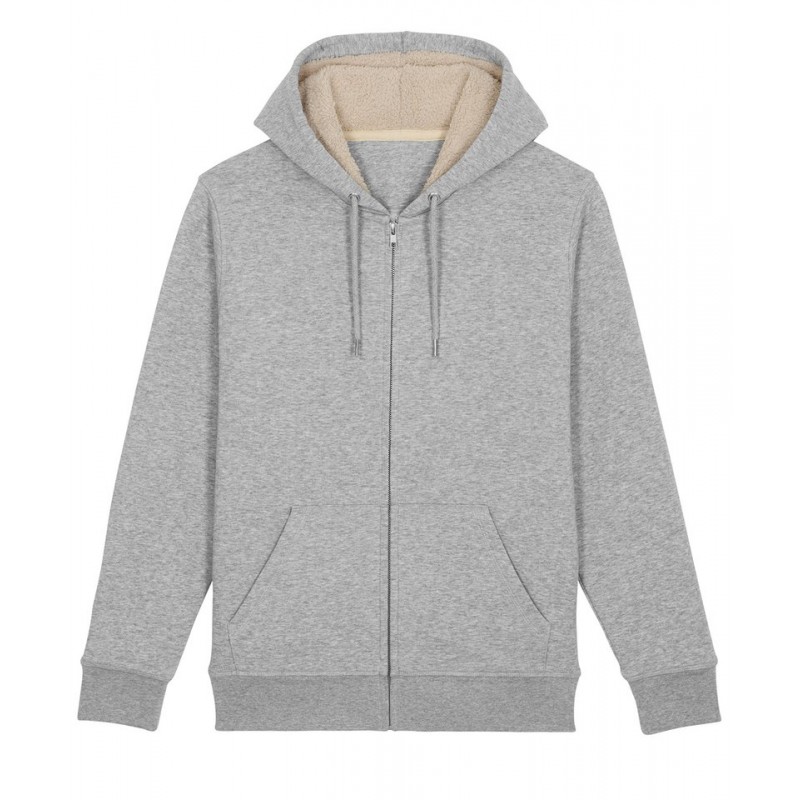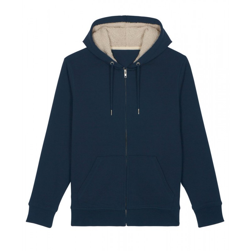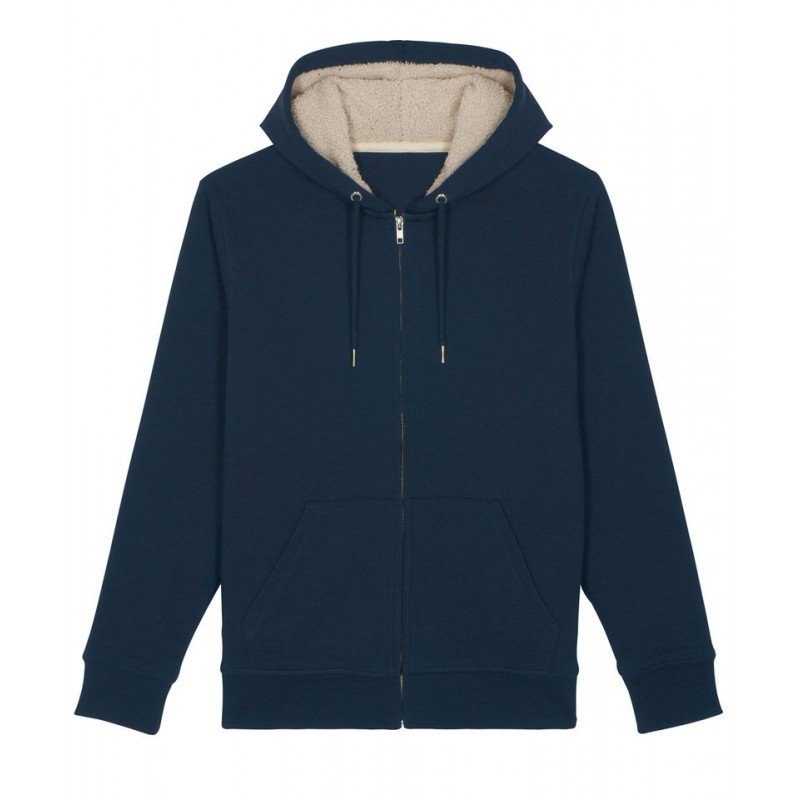 The Sherpa lined zip-through hooded sweatshirt for men and women. Crafted from premium 85% organic cotton, and 15% recycled polyester. Sherpa entirely made from recycled polyester. Featuring premium matt silver trims and zip, with clean herringbone internal tape finishing at zip, an inside pocket and an invisible zip at the bottom hem for easy decoration.