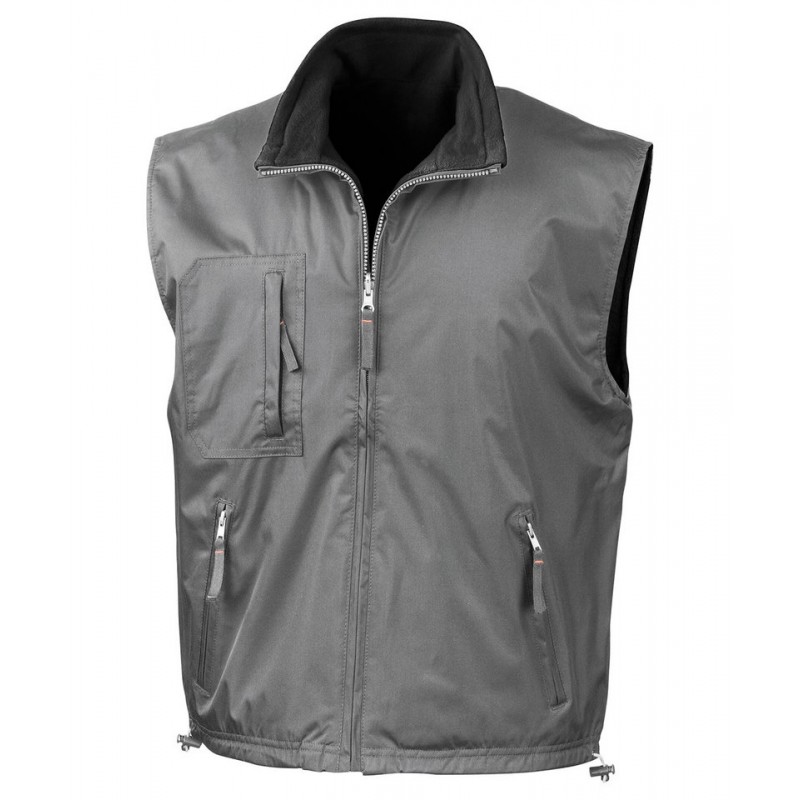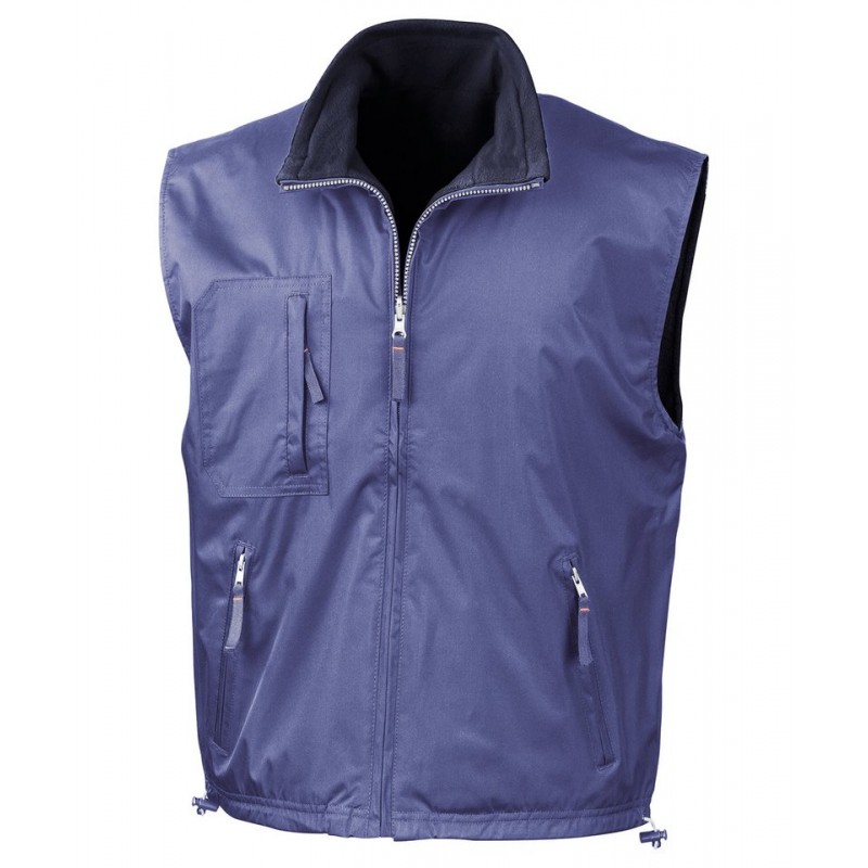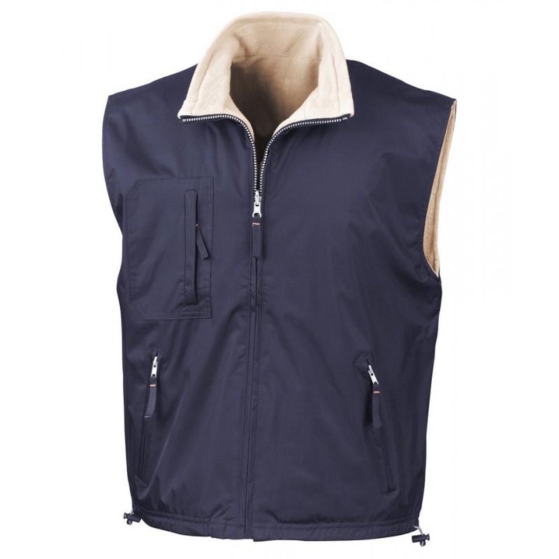 A unique reversible weatherproof bodywarmer benefitting from 280g/m² fleece to one side and water repellent polyester with PVC coating to the other. Reversible functionality that will perform well as a weatherproof outer or an insulating layer.