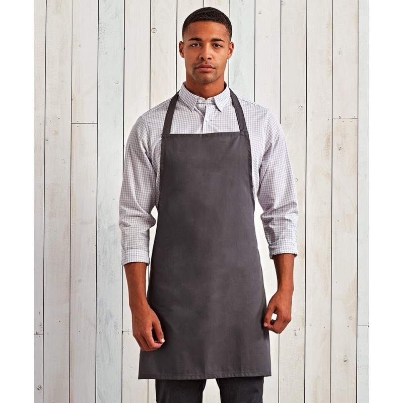 Features Essential Premier bib apron. Self fabric neck tie and self fabric ties 78cm long.