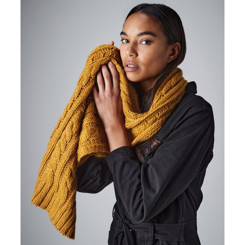 | Features | TearAway adhesive fabric label. Heavyweight melange cable knit. Chunky, wrap-around design. Hand-knitted feel. Unisex styling. |